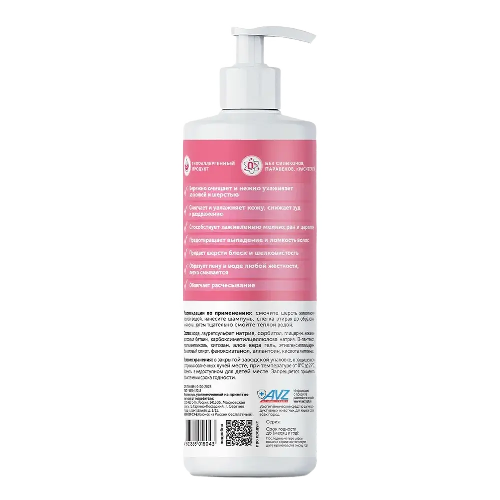 Формула без отдушек и красителей. Алоэ вера, D-пантенол и аллантоин успокаивают и восстанавливают кожу. Хитозан увлажняет шерсть и предотвращает спутывание. Безопасен для регулярного использования у щенков и котят всех пород, включая беременных и лактирующих самок.